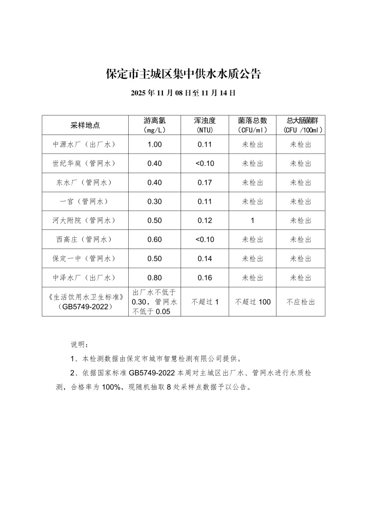 主城区集中供水水质公告(11月08日至11月14日)