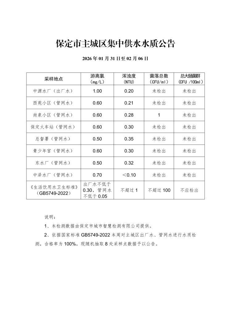 主城区集中供水水质公告(01月31日至02月06日)