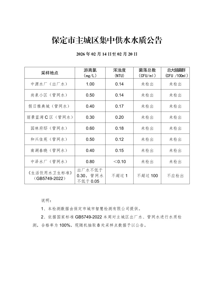 主城区集中供水水质公告(02月14日至02月20日)