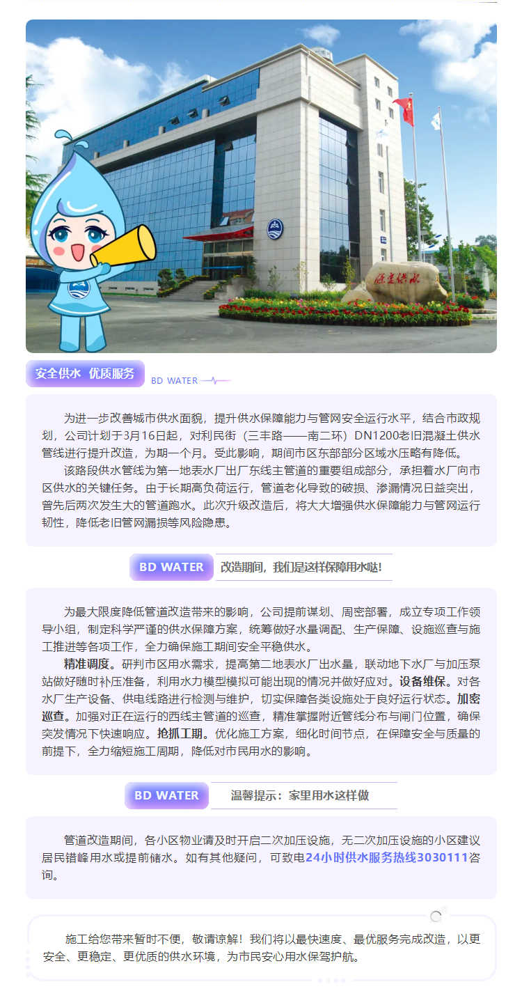 供水主管道升级改造!请注意用水变化
